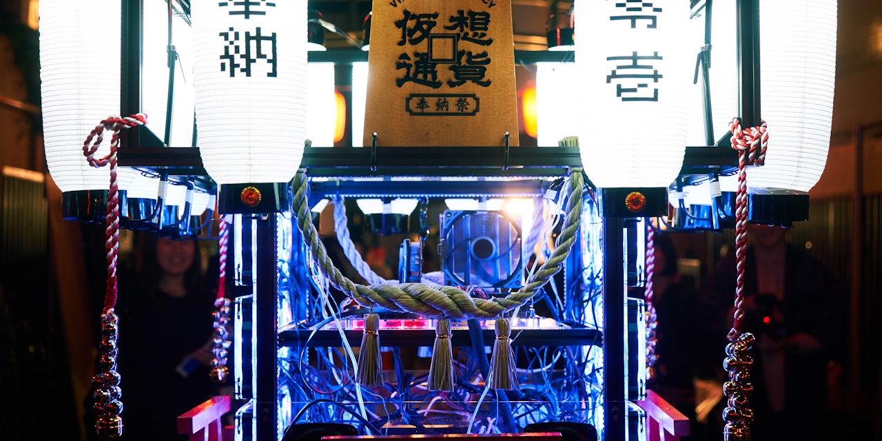 「神事のアップデート」をテーマに、世界中から仮想通貨を集めてリアルタイムに神輿に反映させ、集まった仮想通貨は「土地の豊穣」のために再分配する都市の新たな祝祭や伝承をつくるプロジェクト。世界中から仮想通貨を奉納できるシステムを搭載した「サーバー神輿」により、土地に祝福をもたらす儀式を行う。着金に反応して神輿に搭載された大量のLEDファンが回転しながらギラギラと発光し、人工知能が音声合成した祈りの言葉が爆音で鳴り響き、神輿の担ぎ手のバイブスを上げる「ワッショイ・セレブレーション機能」が発動する。MATではArtStickerバージョンとして登場。Stickerでの投げ銭に応じてインタラクションし、バーチャル空間にも影響を及ぼすハイブリッド型神輿のプロトタイプを実験的に発表する。 photo: 黒羽政士