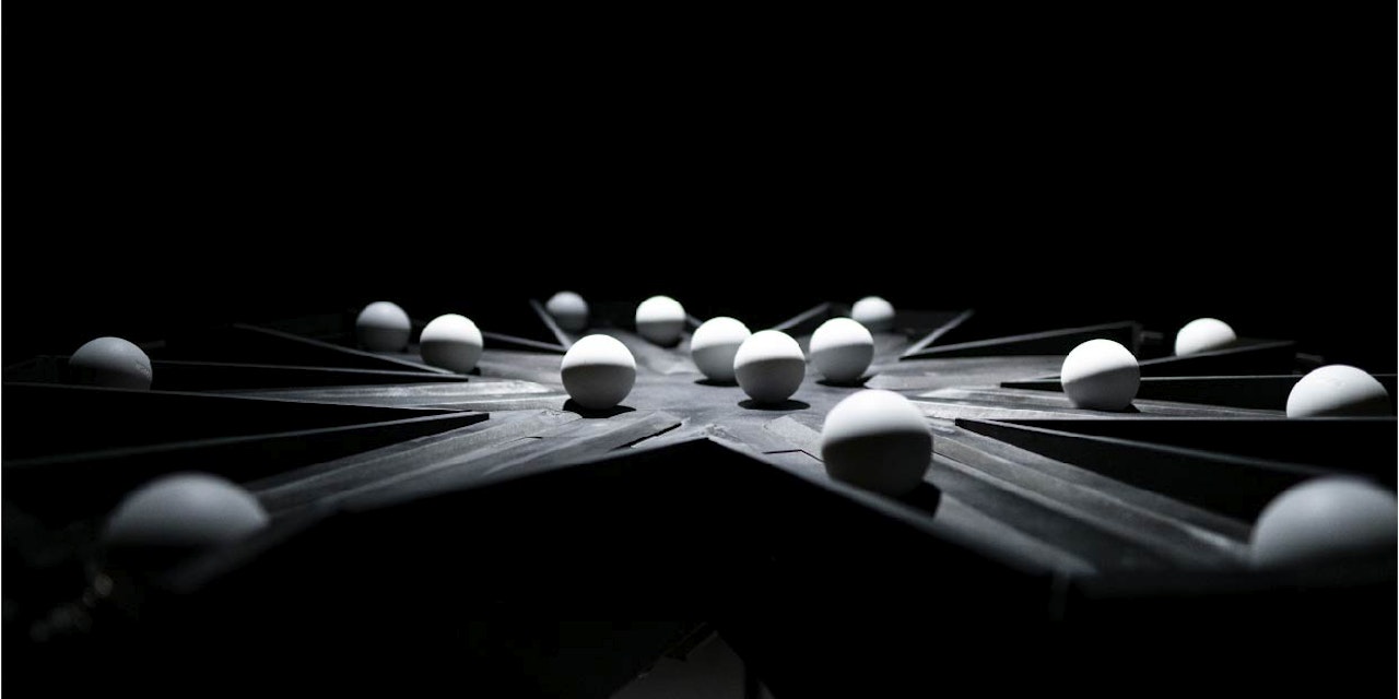 The theme of this work is “the possibility of exhibiting performance”. A structure that wooden rail crosses in the middle from 8 directions. Functional parts (Solenoids) are equipped on the rail so that the balls cross each other and the Solenoids facing each other play catch. 16 balls continue to intersect without hitting. However,what I want to create is not a robot that just keeps moving. What I want to create is a performance. This work had its base adjusted to the accuracy of failing once about every 5 minutes. By setting up it 3 minutes per run,successes and failures are mixed,and you get different results each time you see it. It is interesting no matter how many times you watch it. I aimed for such a work.