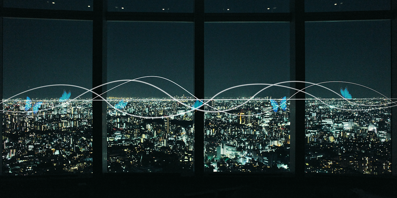 This artwork transforms the horizons seen from Roppongi Hills. This piece adds light and images to the lines that form the boundary between sky and earth. Using a computer and a display device, here I draw “Material Transformation of Digital Nature" on the borderline of ideas seen from the observatory location. photo: Yoichi Ochiai